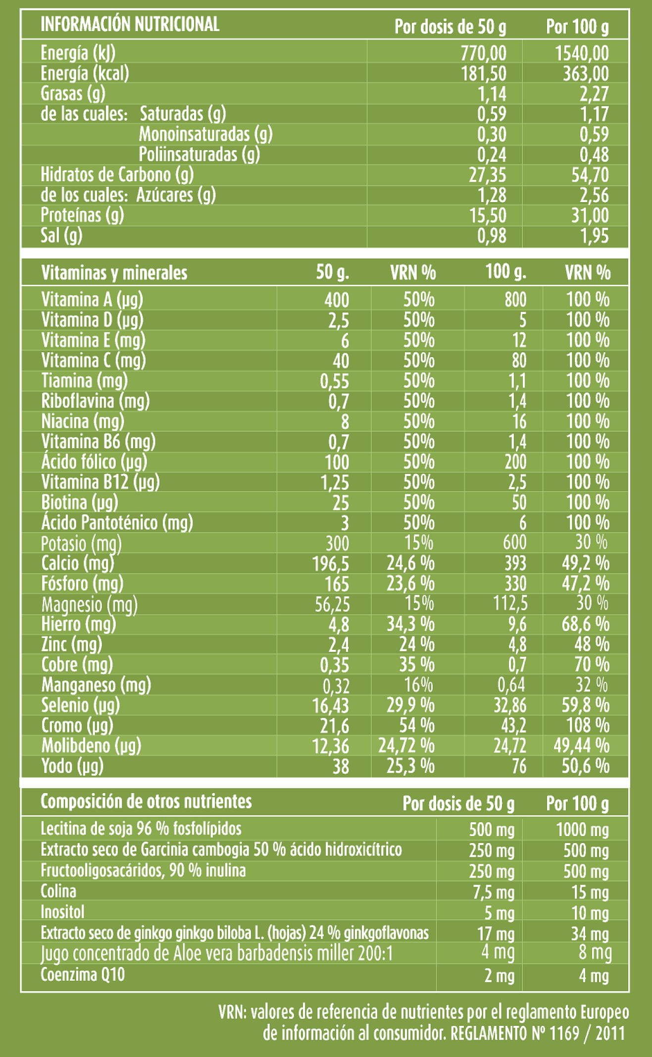 Maltodextrina, proteína de suero de la leche, proteína de soja, mezcla de minerales(citrato potásico, sodio fosfato, sales cálcicas del ácido ortofosfórico (contiene derivados de la soja), calcio carbonato, magnesio oxido, hierro citrato, zinc gluconato, cobre gluconato, manganeso gluconato, yoduro potásico, selenito sódico, cromo picolinato, amonio molibdato), espesante (semillas de Goma Guar), lecitina de soja, espesante (pectina de manzana), E.S Garcinia cambogia (frutos), fructoligosacaridos, vainillina, mezcla vitaminas (acido l-ascórbico, maltodextrina, nicotinamida, colina, inositol, pantotenato cálcico, riboflavina, tiamina, ácido pteroilmonoglutámico, biotina, colecalciferol, cianocobalamina), aroma de vainilla, edulcorante (glucósido de esteviol), E.S. Ginkgo Biloba (hojas), vitamina E acetato, colina, inositol, Aloe barbadensis miller 200:1 polvo (hojas), vitamina A retinol acetato, coenzima Q 10.