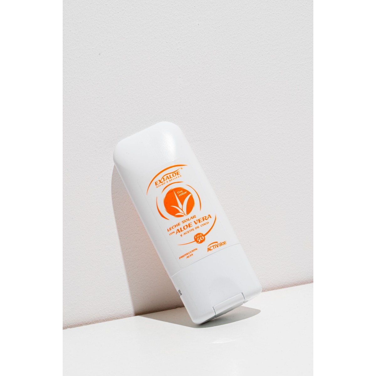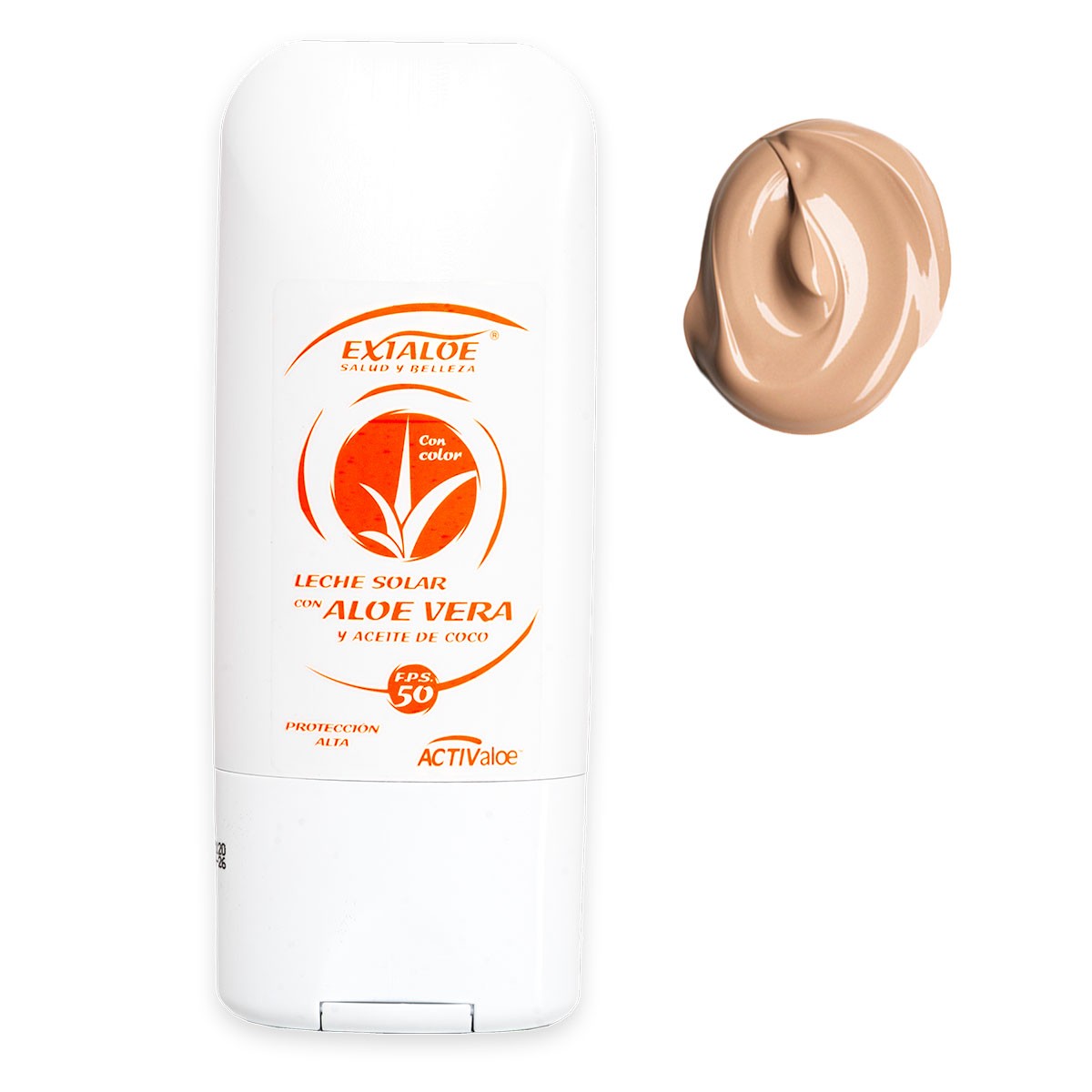 Notre LAIT SOLAIRE EXIALOE SPF 50 AVEC COULEUR contient un filtre physique, qui assure une protection adéquate contre les radiations solaires ultraviolettes, tant UVA que UVB, agissant comme un écran pour que les attaques "rebondissent" comme s'il s'agissait d'un bouclier, mais favorisant en même temps le bronzage de manière uniforme et sûre. Ceci est possible grâce aux ingrédients actifs et à la combinaison de l'olive, de la noix de coco, de la carotte, du tournesol, du bêta-carotène et de notre jus d'aloe vera.