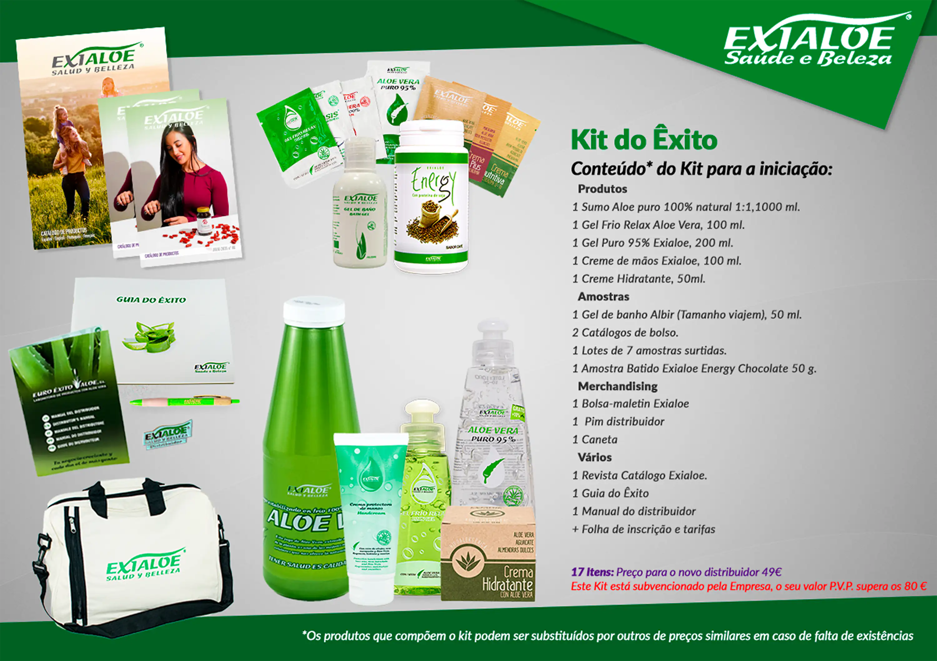 Para começar seu negócio com a EXIALOE, você só precisa adquirir na loja o Kit do Sucesso (será o único investimento que terá que fazer) para a iniciação, usando o código de promoção fornecido pelo distribuidor que apresentou os produtos a você. Esse distribuidor informará sobre todas as oportunidades que o negócio com a EXIALOE oferece e explicará o sistema de vendas e comissões tão simples e lucrativo que a empresa dispõe.